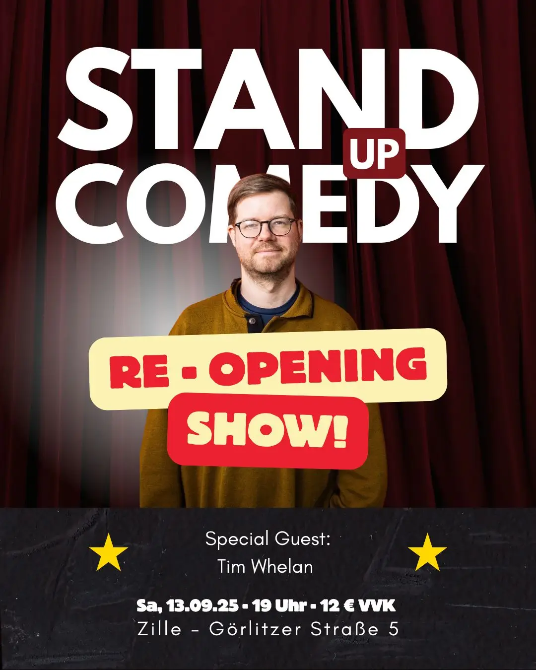 Dass das Konzept funktioniert, zeigt das Open Mic von DREIECKS Comedy, seit Längerem eindrucksvoll. Zur großen Wiedereröffnung der Zille am 13.09.2025 weihen wir deshalb direkt die neue Bühne ein! Und zwar mit Lachern bis zum Umfallen. Und wer könnte da besser herhalten, als unser guter Kollege und Special Guest Tim Whelan ?!